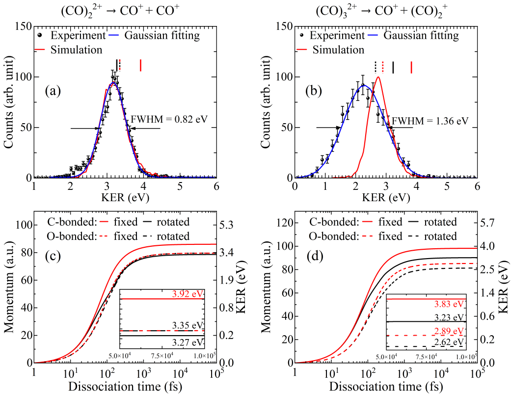 為了解釋這一實(shí)驗(yàn)現(xiàn)象,科研人員在傳統(tǒng)的點(diǎn)電荷模型基礎(chǔ)上,引入了更高階的電荷分布模型,并特別考慮了CO+的電荷分布和電偶極矩。結(jié)果表明,偶極作用誘導(dǎo)了CO?碎片的轉(zhuǎn)動(dòng)激發(fā)。這種能量傳遞機(jī)制充分解釋了實(shí)驗(yàn)與理論之間的差異,同時(shí)揭示了庫倫爆炸過程偶極相互作用誘導(dǎo)的CO?碎化。