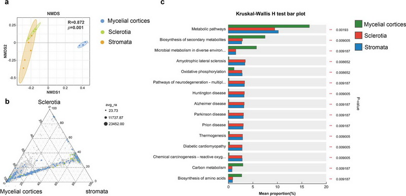 中國科學(xué)院西北高原生物研究所青藏高原植物適應(yīng)與進(jìn)化研究團(tuán)隊研究鑒定出4,561個細(xì)菌OTU,其中2980個為稀有類群(相對豐度<0.01%)。宏基因組分析顯示,外部菌絲皮層富集576個代謝通路(如碳代謝、次級代謝產(chǎn)物合成),顯著高于菌核(117個)和子座(0個)。稀有類群雖豐度低,但貢獻(xiàn)了關(guān)鍵物質(zhì)循環(huán)基因(如氮代謝基因narG、nosZ),提示其具有“功能庫”作用。共現(xiàn)網(wǎng)絡(luò)分析揭示,外部菌絲皮層微生物呈現(xiàn)獨特的模塊化結(jié)構(gòu),Proteobacteria和Bacteroidetes形成高連接度核心網(wǎng)絡(luò)。該區(qū)域特異性富集Caballeronia、Dyella等具有降解功能的細(xì)菌屬,可能在昆蟲幼蟲分解和宿主防御中發(fā)揮屏障作用。通過優(yōu)化培養(yǎng)組培養(yǎng)體系,成功分離52株細(xì)菌(覆蓋26屬40種),包括8個高通量測序未檢出的菌株(如Plantibacter、Tardiphaga)。81.2 %的目級類群實現(xiàn)可培養(yǎng),為后續(xù)功能驗證和資源利用奠定基礎(chǔ)。
