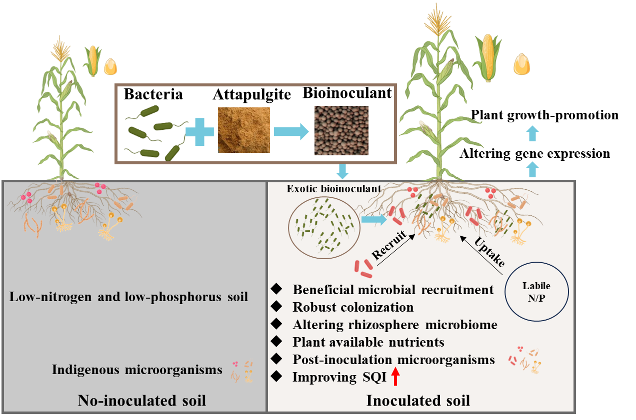 中國科學(xué)院西北生態(tài)環(huán)境資源研究院王若愚研究員團(tuán)隊(duì)與奧地利國家技術(shù)研究院的Angela Sessitsch教授和Günter Brader教授合作,系統(tǒng)揭示了固體顆粒微生物菌劑(貝萊斯芽孢桿菌Bacillus velezensis FZB42與粘土材料組成)通過調(diào)控根際微生物群落和玉米基因應(yīng)答,改善貧瘠堿性黃土質(zhì)量并促進(jìn)玉米生長的機(jī)制。研究設(shè)置了減施氮肥與不施磷肥的處理?xiàng)l件,探索了微生物菌劑在低外源肥料施用下,如何提高作物對(duì)土壤養(yǎng)分的吸收,進(jìn)而促進(jìn)增產(chǎn)的效果。