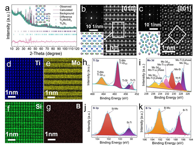 近日,中國科學(xué)院蘭州化學(xué)物理研究所蘭州潤滑材料與技術(shù)創(chuàng)新中心基于T2相通過M位合金化構(gòu)筑策略成功合成了具有面外化學(xué)有序的四元層狀過渡金屬硼化物MAB相—Ti4MoSiB2陶瓷(圖1),并系統(tǒng)研究了其在寬溫域內(nèi)的力學(xué)性能和摩擦學(xué)行為,研究人員發(fā)現(xiàn)材料原子尺度上的層狀結(jié)構(gòu)在穿晶斷裂時有效引導(dǎo)裂紋偏轉(zhuǎn),改變裂紋擴展路徑,提高低溫斷裂韌性;由于晶粒沿不同方向熱膨脹差異造成晶界的熱失配,進而改變了斷裂模式,使材料在室溫至1000℃范圍內(nèi)表現(xiàn)出優(yōu)異的綜合力學(xué)性能,同時賦予了較傳統(tǒng)陶瓷優(yōu)異的損傷容限。與DD5高溫合金對摩時在全溫度范圍內(nèi)都具有良好的抗磨性能,尤其在高溫條件下摩擦化學(xué)反應(yīng)生成的具有氧空位TiO2,一定程度上實現(xiàn)減摩效果,并實現(xiàn)了“負磨損”現(xiàn)象。這些發(fā)現(xiàn)不僅豐富了MAB相材料的基礎(chǔ)理論,也為開發(fā)新型高溫結(jié)構(gòu)功能一體化材料提供了重要指導(dǎo)。