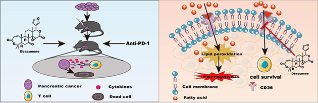 胰腺癌是一種惡性程度極高的消化系統(tǒng)腫瘤,五年生存率不足10%,目前缺乏有效的臨床治療措施,嚴(yán)重影響人類生命健康。近期,研究團(tuán)隊發(fā)現(xiàn)黃柏酮能顯著增強(qiáng)抗PD-1免疫療法治療胰腺癌的效果,增加腫瘤組織中免疫標(biāo)志物CD4+和CD8+T細(xì)胞的浸潤而抑制腫瘤生長,蛋白質(zhì)組學(xué)分析發(fā)現(xiàn)黃柏酮主要通過調(diào)控CD36介導(dǎo)的PPAR信號通路,抑制胰腺癌PANC-1細(xì)胞CD36表達(dá),增加CD8+ T細(xì)胞數(shù)量,促進(jìn)胰腺癌細(xì)胞凋亡,從而抑制胰腺癌細(xì)胞生長。相關(guān)研究成果發(fā)表在European Journal of Pharmacology(994 (2025) 177367)上。