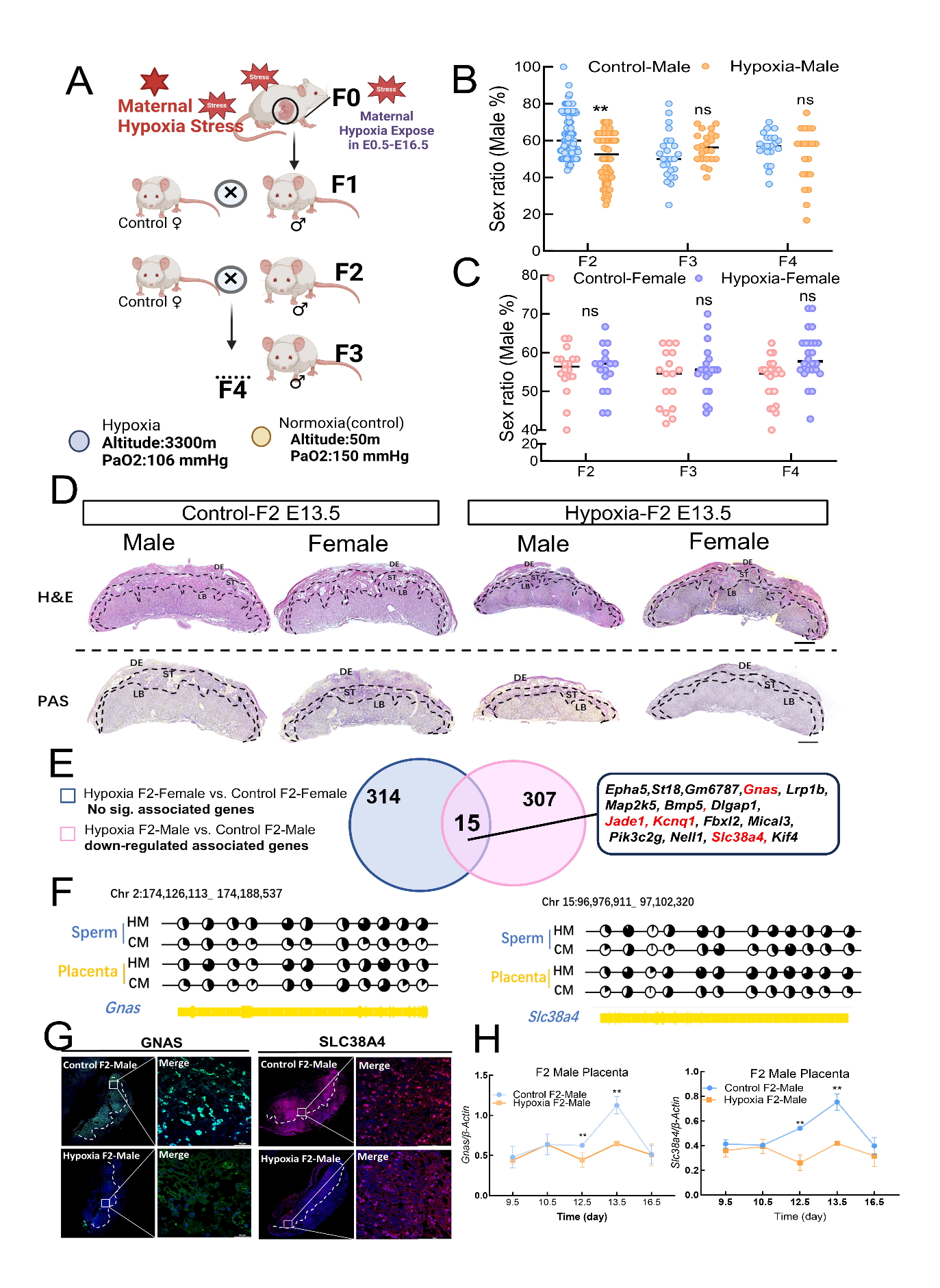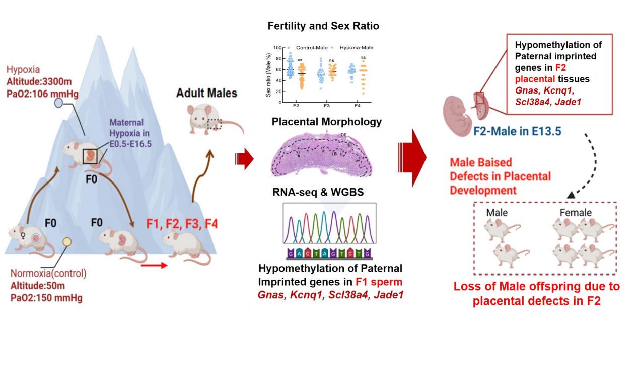為探究母體低氧環(huán)境暴露對子代的跨代影響,中國科學(xué)院西北高原生物研究所動物生態(tài)與資源保護(hù)研究團(tuán)隊(duì)建立了孕期低氧暴露小鼠模型,將經(jīng)歷過孕期低氧暴露的小鼠(F0)轉(zhuǎn)運(yùn)至低海拔后,出生的雄性小鼠和對照雌鼠合籠,連續(xù)飼養(yǎng)四代(F1-F4)。從2018年 9月到 2023年 8月,通過大量出生性別統(tǒng)計(jì)和不同發(fā)育階段的性別鑒定,發(fā)現(xiàn)母體孕期低氧暴露會造成F2代雄性個(gè)體顯著減少。進(jìn)一步的分析發(fā)現(xiàn)F2雄性減少是由于在胚胎期13.5天發(fā)生的胚胎特異性丟失。雄性胚胎丟失的主要原因?yàn)樘ケP形態(tài)和功能異常。研究團(tuán)隊(duì)通過胎盤轉(zhuǎn)錄組和全基因組DNA甲基化測序聯(lián)合分析,發(fā)現(xiàn)父源印記基因Slc38a4,Gnas,Jade1 和Kcnq1表達(dá)異常。隨后,通過對F1代小鼠成熟精子與F2代雄性胎盤全基因組DNA甲基化進(jìn)行聯(lián)合分析,結(jié)果發(fā)現(xiàn)以上印記基因DNA甲基化模式高度相似。這說明經(jīng)歷胚胎期低氧的F1代雄性小鼠的精子存在甲基化異常,并且可以進(jìn)一步影響F2雄性個(gè)體生長發(fā)育進(jìn)而導(dǎo)致性別比例異常。該工作系統(tǒng)地揭示母體低氧暴露對F1及F2代發(fā)育影響的跨代遺傳機(jī)制,為深入理解高原低氧暴露的生殖和健康風(fēng)險(xiǎn)提供了新的表型數(shù)據(jù)。