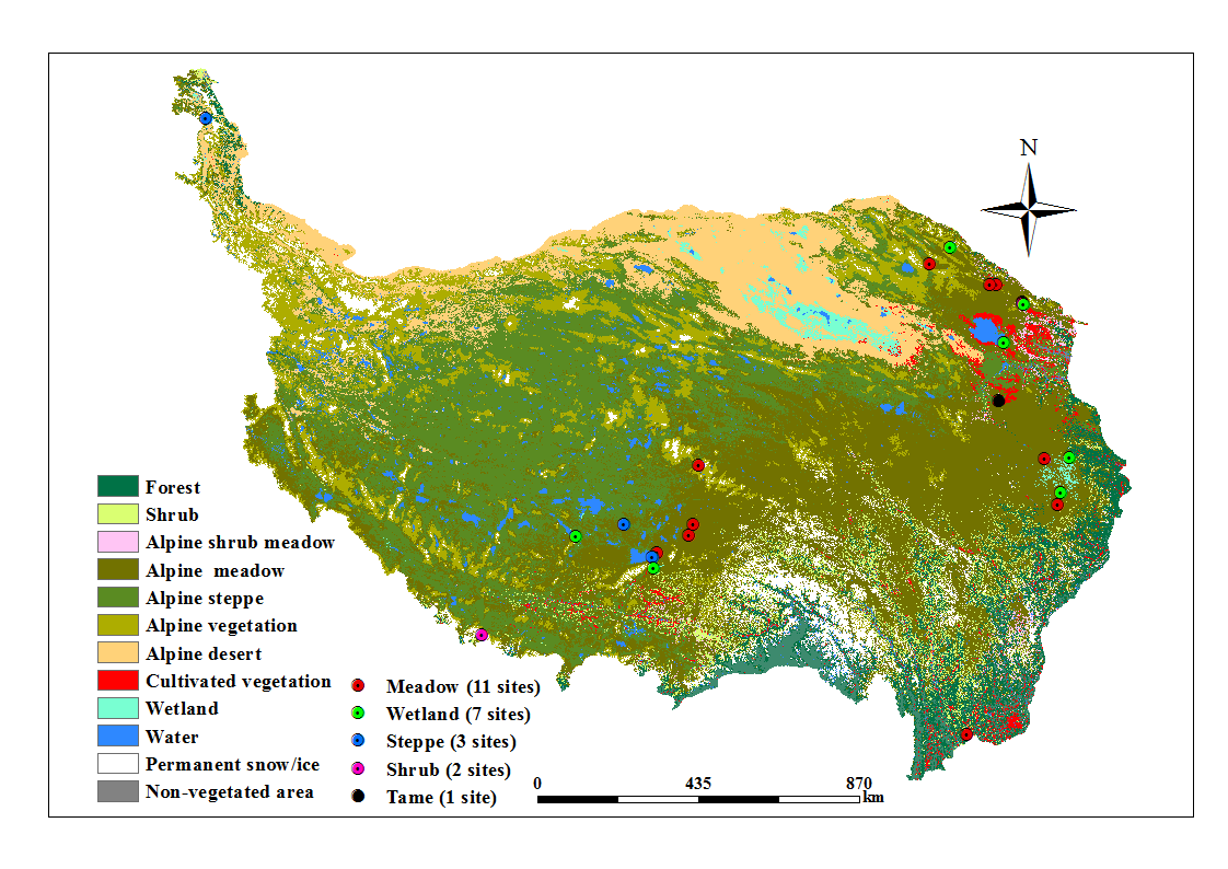 圖2青藏高原 24 個渦度相關(guān)觀測站點的位置