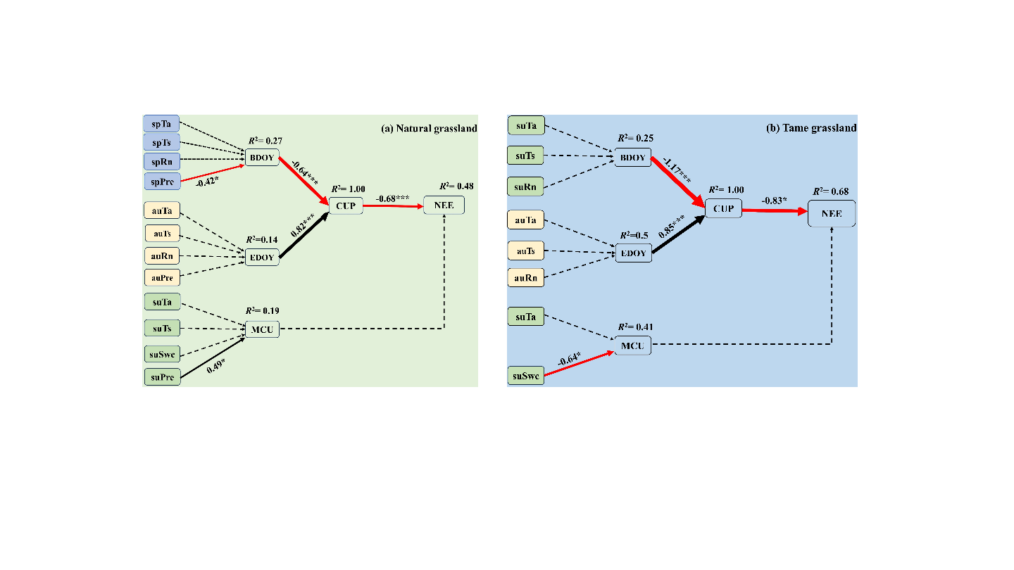 通過研究發(fā)現(xiàn),NEE 年際變異中 38% 的貢獻來自 CUP, MCU貢獻 18%,證實延長碳吸收周期對增強碳匯的效應優(yōu)于提升最大碳吸收速率。同時,天然草地CUP起始日期受春季降水顯著驅(qū)動,春季降水成為啟動碳吸收周期的關(guān)鍵"扳機";夏季水分可利用性對天然草地 MCU 呈負向調(diào)節(jié),卻能促進人工草地 MCU 提升。人類管理措施(如播種、收割)主導人工草地 CUP 動態(tài),其碳吸收周期(106 天)較天然草地縮短約 30 天,直接影響 NEE 年際波動。生態(tài)系統(tǒng)對比顯示,高寒草原雖擁有最長 CUP(147 天),但碳吸收強度最低;高寒濕地以最高 MCU(-5.02 g C m?2 d?1)成為高原最強"碳匯熱點"。此外,冬季生態(tài)系統(tǒng)呼吸占全年總量 15%,主要受降雪量和凈輻射調(diào)控;CUP 持續(xù)時間由早期降水和草地類型共同決定,是導致 NEE 年際變異及生態(tài)系統(tǒng)差異的核心因素。未來將聚焦氣候異常對 CUP 和 MCU 的影響機制,進一步完善高原碳匯動態(tài)預測模型,為全球變化背景下的生態(tài)安全保障提供科技支撐。