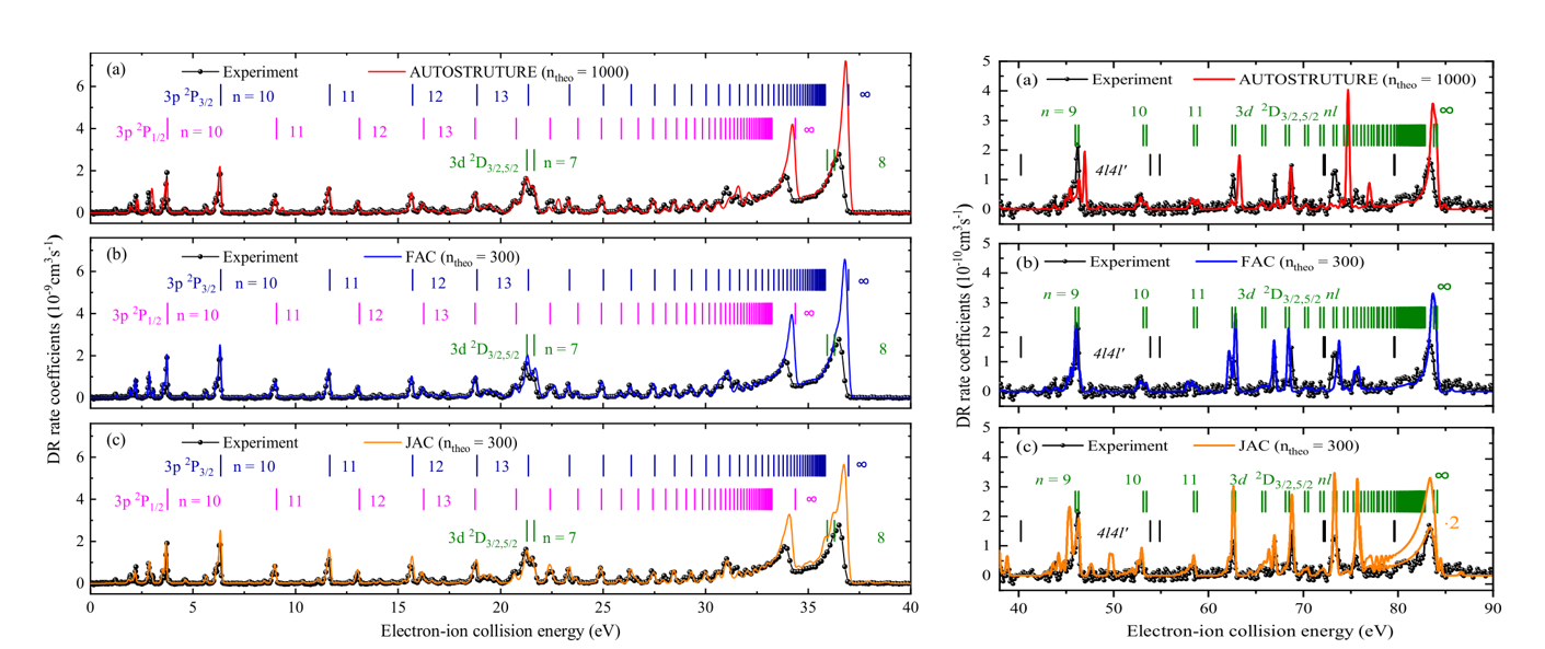 圖1:類鈉Fe15+離子的雙電子復合精密譜。測量的電子-離子相對能量范圍為 0- 90 eV,包含了 3?? → 3??和 3?? → 3??(Δ?? = 0)核心激發(fā)以及所有4?4?′ 共振相關(guān)的DR共振結(jié)構(gòu)。在0到40 eV的能量范圍內(nèi),AUTOSTRUTURE、FAC和JAC理論計算 結(jié)果與實驗數(shù)據(jù)非常一致。然而,在40到90eV的能量范圍內(nèi),由于4?4?′共振具有強電子關(guān)聯(lián)效應,三種理論計算結(jié)果與實驗數(shù)據(jù)之間均存在差異。