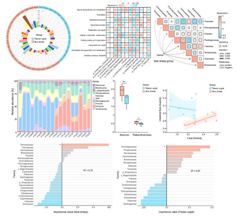 中國科學院西北高原生物研究所動物生態(tài)與資源保護研究團隊在青海省昆侖山地區(qū)采集了西藏盤羊與巖羊的新鮮糞便樣本,結(jié)合宏基因組測序與植物 trnL片段的高通量測序技術,深入分析了兩者腸道菌群組成、功能特征及食性結(jié)構(gòu)與腸道菌群在生態(tài)適應與營養(yǎng)生態(tài)位分化中的潛在作用。研究發(fā)現(xiàn),西藏盤羊與巖羊共棲于高寒生態(tài)環(huán)境中,但其腸道菌群在組成結(jié)構(gòu)與功能特征方面表現(xiàn)出了顯著差異。食性多樣性的高低并不必然反映腸道菌群多樣性的水平,其中西藏盤羊雖食性相對單一,但其腸道菌群多樣性更高,具有更強的代謝適應性與纖維降解能力;而巖羊擁有更廣泛的植物攝食譜,卻表現(xiàn)出在糖類代謝相關功能上更強的腸道菌群代謝適應能力。綜合來看,腸道菌群與食性之間的協(xié)同作用可能在推動兩物種營養(yǎng)生態(tài)位分化中發(fā)揮重要作用。此外,兩種動物在抗生素耐藥基因組成上也存在差異,提示該類指標在未來野生動物健康評估中具有潛在應用價值。本研究揭示了腸道菌群作為宿主環(huán)境適應和生態(tài)位分化的重要調(diào)控因子,其與食性協(xié)同作用推動了高原野生動物的生態(tài)位分化。研究成果為理解大型食草動物腸道菌群與環(huán)境適應及生態(tài)位分化提供了全新視角,也為瀕危物種保護和高原生態(tài)系統(tǒng)可持續(xù)發(fā)展提供了重要參考。
