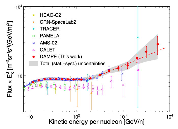 近期,暗物質粒子探測衛(wèi)星(DAMPE)“悟空”號國際合作組在高能宇宙線能譜測量方面取得重要進展,獲得了宇宙射線硼元素在10 GeV/n–8 TeV/n的微分通量譜,首次發(fā)現(xiàn)了182 GeV/n附近能譜“硬化”的現(xiàn)象。研究成果發(fā)表于《物理評論快報》(Physical Review Letters)。