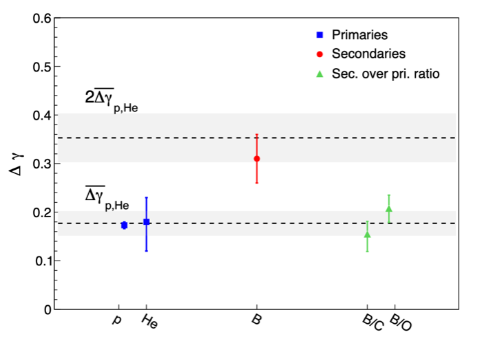 圖3:“悟空”號觀測到的硼元素譜指數(shù)變硬程度(?γ)約為初級宇宙線質子和氦核的兩倍