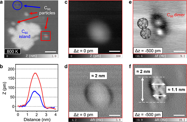圖2. nc-AFM表征Pt(111)上C60島的熱演化。