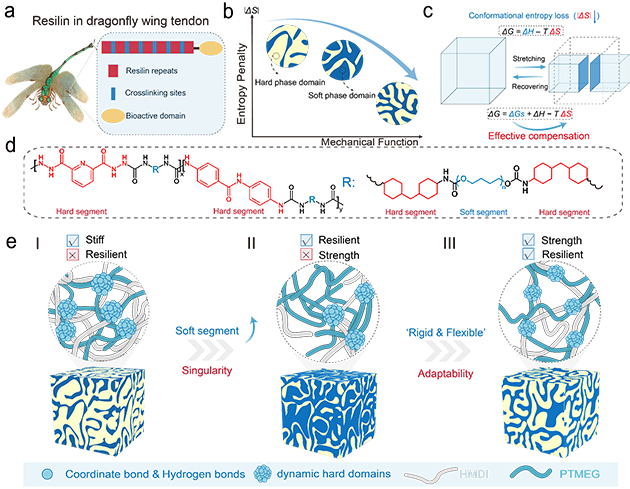 圖1. 受蜻蜓角質(zhì)層中彈性蛋白啟發(fā)的低熵罰聚氨酯彈性體設(shè)計制備示意圖