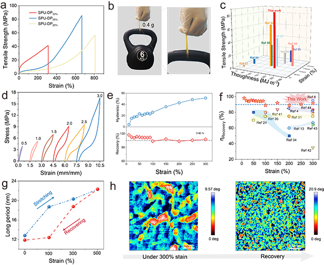 最后,研究人員通過機械性能測試證明,利用動態(tài)硬域精準控制微相分離,成功實現(xiàn)了聚氨酯彈性體在力學(xué)性能上的調(diào)控,突破了長期以來高強度和高彈性無法兼容的瓶頸。調(diào)控優(yōu)化后的聚氨酯彈性體斷裂強度超過80MPa以上,該拉伸強度超過了目前已報道的大多數(shù)人工合成彈性體。此外,該優(yōu)化的聚氨酯彈性體在短程應(yīng)變下表現(xiàn)出超過90%的回彈效率,且在長程應(yīng)變下超過88%,該回彈效率也超過了目前所報道的大多人工合成彈性體,在短程變形時甚至可與生物彈性蛋白相媲美。