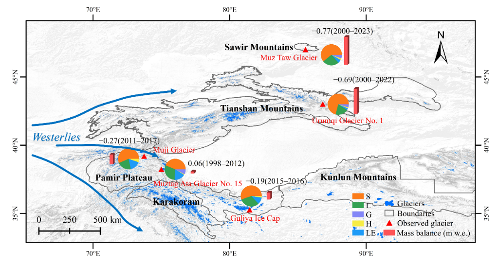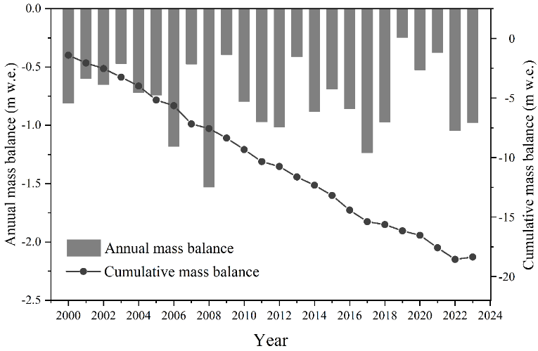 該研究成果以Mass balance reconstruction of a reference glacier in central Asia during 2000–2023: Integrating simulation and in-situ measurements為題發(fā)表于氣候變化領(lǐng)域權(quán)威期刊Advances in Climate Change Research。西北研究院王璞玉研究員為論文第一作者和通訊作者。該研究得到國家自然科學(xué)基金、中國科學(xué)院青促會優(yōu)秀會員項(xiàng)目、冰凍圈科學(xué)與凍土工程全國重點(diǎn)實(shí)驗(yàn)室自主部署項(xiàng)目等聯(lián)合資助。