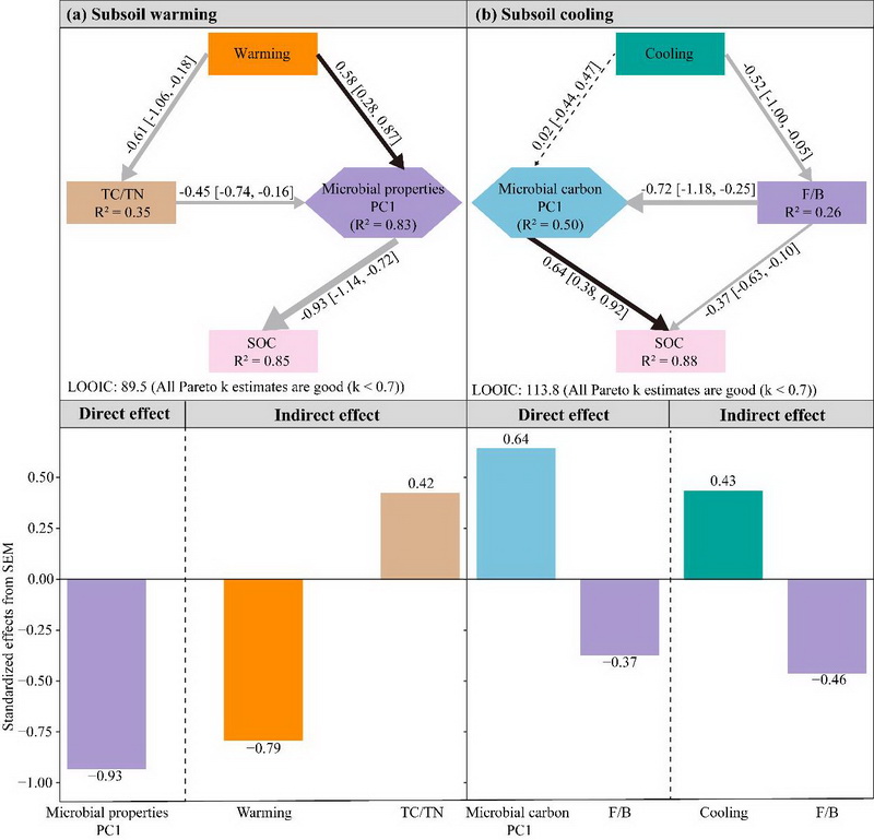 研究發(fā)現(xiàn),高寒草甸亞表層土壤有機(jī)碳對增溫、降溫的響應(yīng)較表層更為敏感,無論是增溫還是降溫,均未引起亞表層土壤中植物和微生物源碳組分的顯著變化。然而,增溫使真菌與細(xì)菌生物量比值(F/B)和革蘭氏陽性細(xì)菌與革蘭氏陰性細(xì)菌生物量比值(G+/G-)分別增加15.0%和8.6%,而降溫則使其分別降低4.5%和9.6%。進(jìn)一步分析發(fā)現(xiàn),增溫主要通過增加F/B和G+/G-直接減少土壤有機(jī)碳庫的積累,同時(shí)降低土壤碳氮比間接減少亞表層土壤有機(jī)碳含量,而降溫則主要通過降低F/B增加亞表層土壤有機(jī)碳含量。如果只考慮增溫而不考慮降溫的作用,傳統(tǒng)的增溫控制實(shí)驗(yàn)可能會低估氣候變暖對高寒草地亞表層土壤有機(jī)碳庫的消極作用。該研究為更好地解釋和預(yù)測未來氣候變化背景下高寒草地生態(tài)系統(tǒng)土壤碳庫的形成與變化提供了新的理論依據(jù)。