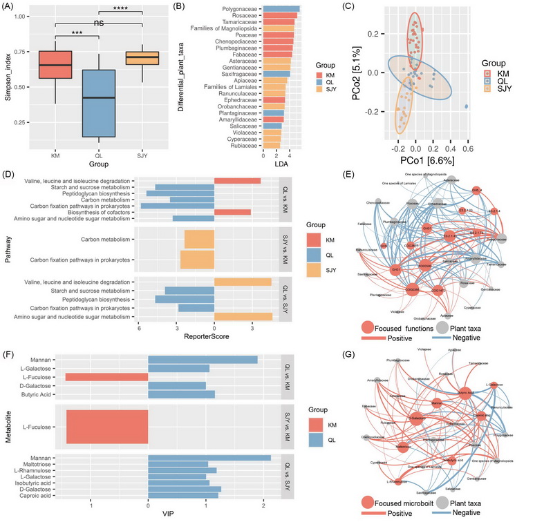 中國科學院西北高原生物研究所動物生態(tài)與資源保護研究團隊在青藏高原青海湖流域、昆侖山及三江源三大典型區(qū)域采集了巖羊的新鮮糞便樣本,利用trnL植物DNA條形碼技術(shù)、宏基因組測序技術(shù)和非靶向代謝組學技術(shù),構(gòu)建了巖羊食性 - 微生物 - 代謝物多組學關(guān)聯(lián)分析框架,深入解析了巖羊在青藏高原不同區(qū)域的食性差異、腸道微生物組成與功能特征及其代謝產(chǎn)物差異,探索了食性結(jié)構(gòu)與微生物共生系統(tǒng)的協(xié)同變異規(guī)律,揭示了宿主 - 微生物共生系統(tǒng)在區(qū)域適應(yīng)中的協(xié)同進化模式。