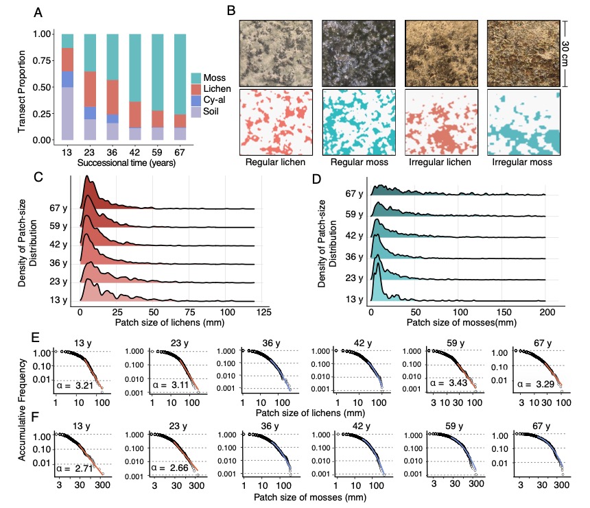 研究團(tuán)隊采用了計算建模與全局-局部耦合的野外調(diào)查相結(jié)合的研究方法。理論建?;诟怕实脑詣訖C(Cellular automaton)模型的開發(fā),模擬了地衣和蘚類斑塊的動態(tài)變化。野外觀測在中國科學(xué)院沙坡頭沙漠試驗研究站進(jìn)行,通過在不同演替階段的人工固沙植被帶中設(shè)置樣線,記錄了生物結(jié)皮的覆蓋度、組成和斑塊大小分布。研究通過對冪律分布的擬合,從全局尺度檢測主導(dǎo)生物結(jié)皮動態(tài)的反饋模式。通過不同演替階段和不同斑塊大小下生物結(jié)皮斑塊中心與邊緣之間的生長差異比較,從斑塊尺度驗證局部自組織過程,對比模擬結(jié)果揭示了生物結(jié)皮自組織機理及其生態(tài)意義。