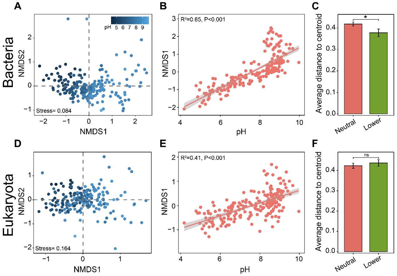 近日,中國科學(xué)院西北生態(tài)環(huán)境資源研究院李玉強(qiáng)研究員團(tuán)隊受Global Change Biology期刊邀請發(fā)表研究成果,利用多元交叉驗證(NMDS+PLS-PM+PERMDISP)方法,系統(tǒng)揭示了土壤酸化過程中細(xì)菌和真核生物β-多樣性的解耦規(guī)律,及細(xì)菌和真核生物群落組成對土壤酸化的響應(yīng)差異,為理解土壤生態(tài)系統(tǒng)穩(wěn)定性提供了新視角。