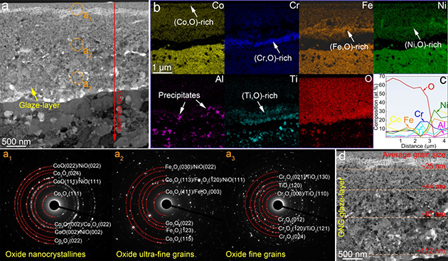 近日,中國科學(xué)院蘭州化學(xué)物理研究所潤滑材料全國重點實驗室高溫摩擦學(xué)課題組與香港城市大學(xué)機(jī)械工程系先進(jìn)結(jié)構(gòu)材料課題組,在長期合作基礎(chǔ)上提出了一種基于晶體-非晶異質(zhì)結(jié)構(gòu)與梯度納米氧化層協(xié)同調(diào)控的高熵納米復(fù)合材料設(shè)計策略。團(tuán)隊設(shè)計制備了一種Co25Ni23Cr20Fe20Ti6Al4B2高熵納米復(fù)合材料,包含高密度Ti–O富集非晶納米析出相的多級異質(zhì)結(jié)構(gòu)。在1000 ℃和較高接觸應(yīng)力條件下,該材料表面原位生成微米級厚度的梯度納米釉質(zhì)層,其晶粒尺寸沿深度方向從表面25nm漸增至基體112nm,實現(xiàn)了應(yīng)變逐層協(xié)調(diào)與應(yīng)力有效緩解。得益于這一結(jié)構(gòu)演化,該材料在1000 °C實驗中獲得了-2.3×10-6mm3/Nm的穩(wěn)定負(fù)磨損率與0.26的低摩擦系數(shù),刷新了金屬基抗磨材料的高溫性能紀(jì)錄。
