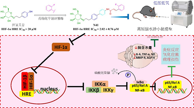 研究團隊聚焦高原腦水腫防治重大問題,以高原特色中草藥紅景天中的活性成分紅景天苷為結構基礎,基于骨架躍遷和分子雜合的藥物設計策略,通過引入鄰氟苯基HIF-1α抑制劑藥效團,對紅景天苷的糖苷鍵、連接鏈、芳環(huán)取代基等三個部分進行結構修飾,設計并合成了多種紅景天苷衍生物開展構效關系研究。通過雙熒光素酶報告基因、細胞毒、ELISA等實驗,篩選獲得強活性化合物N41,可顯著抑制HIF-1α HRE轉錄(IC50: 2.02 ± 0.76 μM),減少C8-D1A細胞炎癥因子IL-6和NO的表達以及ROS積累,減輕氧化損傷且無明顯細胞毒性。HACE小鼠模型研究發(fā)現(xiàn),N41可有效降低HACE模型小鼠腦含水量,改善缺氧導致的腦組織損傷,通過阻斷HIF-1α/IKKα/NF-κB信號通路,抑制下游TNF-α、IL-6等炎癥因子及MMP-9、AQP-4等血腦屏障通透性相關因子表達,緩解炎癥反應和維持血腦屏障完整性,發(fā)揮高原腦水腫防治功效。相關研究成果發(fā)表在European Journal of Medicinal Chemistry(2025,297: 117982)上。