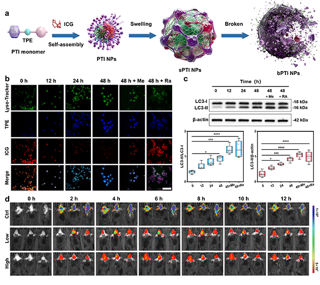 團(tuán)隊(duì)進(jìn)一步探索溶酶體功能變化與Aβ蛋白相分離之間的關(guān)系。通過ATRP合成pH響應(yīng)骨架,將AIE染料四苯乙烯(TPE)共價(jià)接枝,并自組裝包載近紅外ACQ染料吲哚菁綠(ICG),形成AIE/ACQ協(xié)同的比率成像納米結(jié)構(gòu)探針(PTI),實(shí)現(xiàn)AD自噬溶酶體酸化缺陷及其驅(qū)動(dòng)的相分離過程的可視化“全流程”監(jiān)測(cè)。