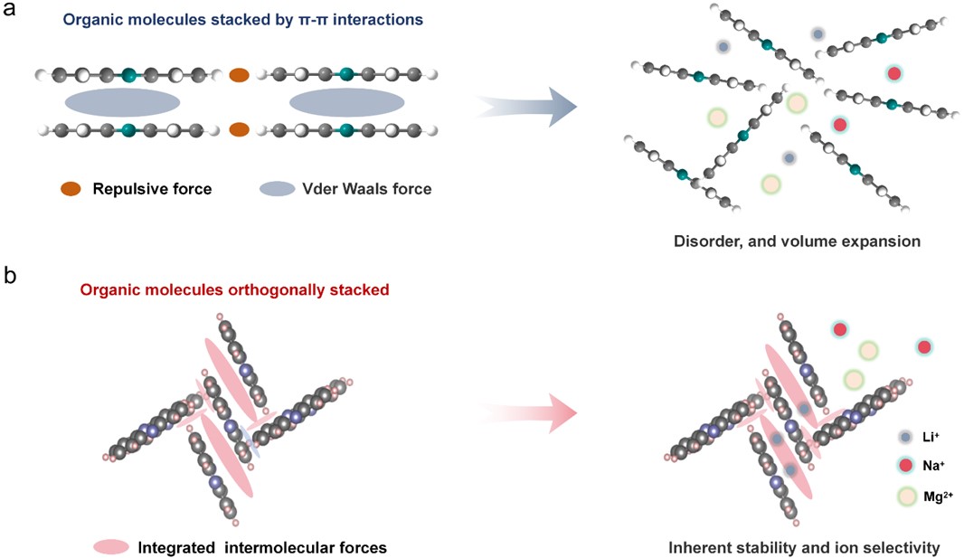 針對(duì)高容量有機(jī)小分子電極因離子插層體積膨脹導(dǎo)致結(jié)構(gòu)坍塌失穩(wěn)的科學(xué)挑戰(zhàn),研究團(tuán)隊(duì)開創(chuàng)性地提出基于分子間作用力網(wǎng)絡(luò)構(gòu)筑穩(wěn)定晶體結(jié)構(gòu)的新思路。以吩嗪為模型體系,研究證實(shí)正交垂直的分子堆疊方式可形成強(qiáng)分子間作用力網(wǎng)絡(luò)和具有離子選擇性的納米孔道。該結(jié)構(gòu)不僅能有效抑制體積膨脹帶來(lái)的機(jī)械失效問(wèn)題,同時(shí)其產(chǎn)生的親鋰孔道在原子尺度對(duì)單價(jià)金屬離子(Li)具有優(yōu)先傳輸與選擇性性能,選擇性提鋰容量高達(dá)109 mg/g。該工作原創(chuàng)性地揭示了分子堆疊微結(jié)構(gòu)與電極材料的宏觀電化學(xué)穩(wěn)定性和離子選擇性之間的內(nèi)在物理化學(xué)規(guī)律,為設(shè)計(jì)新一代兼具高穩(wěn)定性、高選擇性、高通量的有機(jī)電化學(xué)離子捕獲材料奠定了重要理論基礎(chǔ)。