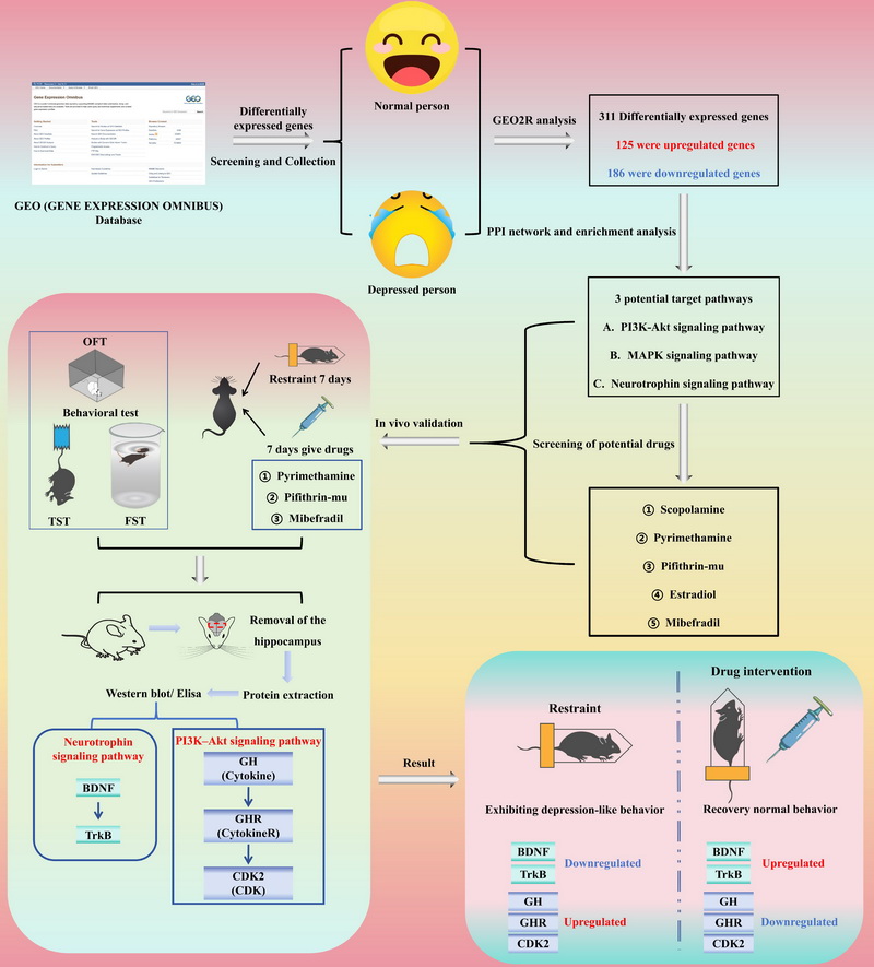 中國科學(xué)院西北高原生物研究所高原藏藥資源質(zhì)控與藥理毒理評(píng)價(jià)研究團(tuán)隊(duì)以抑郁癥患者基因表達(dá)數(shù)據(jù)為基礎(chǔ),先從GEO數(shù)據(jù)庫篩選出311個(gè)差異表達(dá)基因,經(jīng)加權(quán)基因共表達(dá)網(wǎng)絡(luò)分析、蛋白 - 蛋白相互作用網(wǎng)絡(luò)構(gòu)建及通路富集分析,發(fā)現(xiàn)這些基因主要富集于 PI3K-Akt、MAPK 和神經(jīng)營養(yǎng)因子三大與抑郁癥發(fā)病相關(guān)的信號(hào)通路;隨后利用第二代 CMAP 平臺(tái),結(jié)合文獻(xiàn)調(diào)研篩選出3種候選小分子化合物(pyrimethamine,pifithrin-mu,mibefradil),通過分子對(duì)接實(shí)驗(yàn)驗(yàn)證,它們與上述通路關(guān)鍵蛋白(如 CDK2、TrkB 等)親和力高,部分滿足 “強(qiáng)結(jié)合” 標(biāo)準(zhǔn)(≤-7 kcal/mol);接著在慢性束縛應(yīng)激小鼠模型中驗(yàn)證 pyrimethamine,pifithrin-mu,mibefradil的抗抑郁效果,行為學(xué)測(cè)試(曠場(chǎng)試驗(yàn)、強(qiáng)迫游泳試驗(yàn)、懸尾試驗(yàn))顯示三者能顯著改善小鼠抑郁樣行為,效果與氟西汀相當(dāng);機(jī)制研究通過 Western blot 與 ELISA 實(shí)驗(yàn)證實(shí),三者可調(diào)控 PI3K-Akt 和神經(jīng)營養(yǎng)因子通路關(guān)鍵蛋白表達(dá)(降低 GH、GHR、CDK2 異常高表達(dá),上調(diào) BDNF、TrkB 表達(dá)),Pearson 相關(guān)性分析驗(yàn)證了通路調(diào)控與抗抑郁效果的直接關(guān)聯(lián),同時(shí)該研究還證實(shí) “老藥新用” 策略在抗抑郁藥物研發(fā)中的高效性,并建立 “多數(shù)據(jù)庫整合 - 多組學(xué)分析 - 體內(nèi)外驗(yàn)證” 的框架,成功挖掘出 3 種具有抗抑郁潛力的小分子化合物,為抑郁癥治療提供新候選藥物及作用機(jī)制參考。