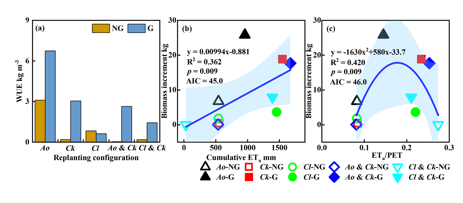 2020-2023年兩種地下水條件及不同植物配置下的水分利用效率(a),以及植物生物量增量變化與累積實際蒸散量 (b)和ETa/PET(c) 的關(guān)系。藍(lán)色陰影表示95%置信區(qū)間,PET:潛在蒸散發(fā)。