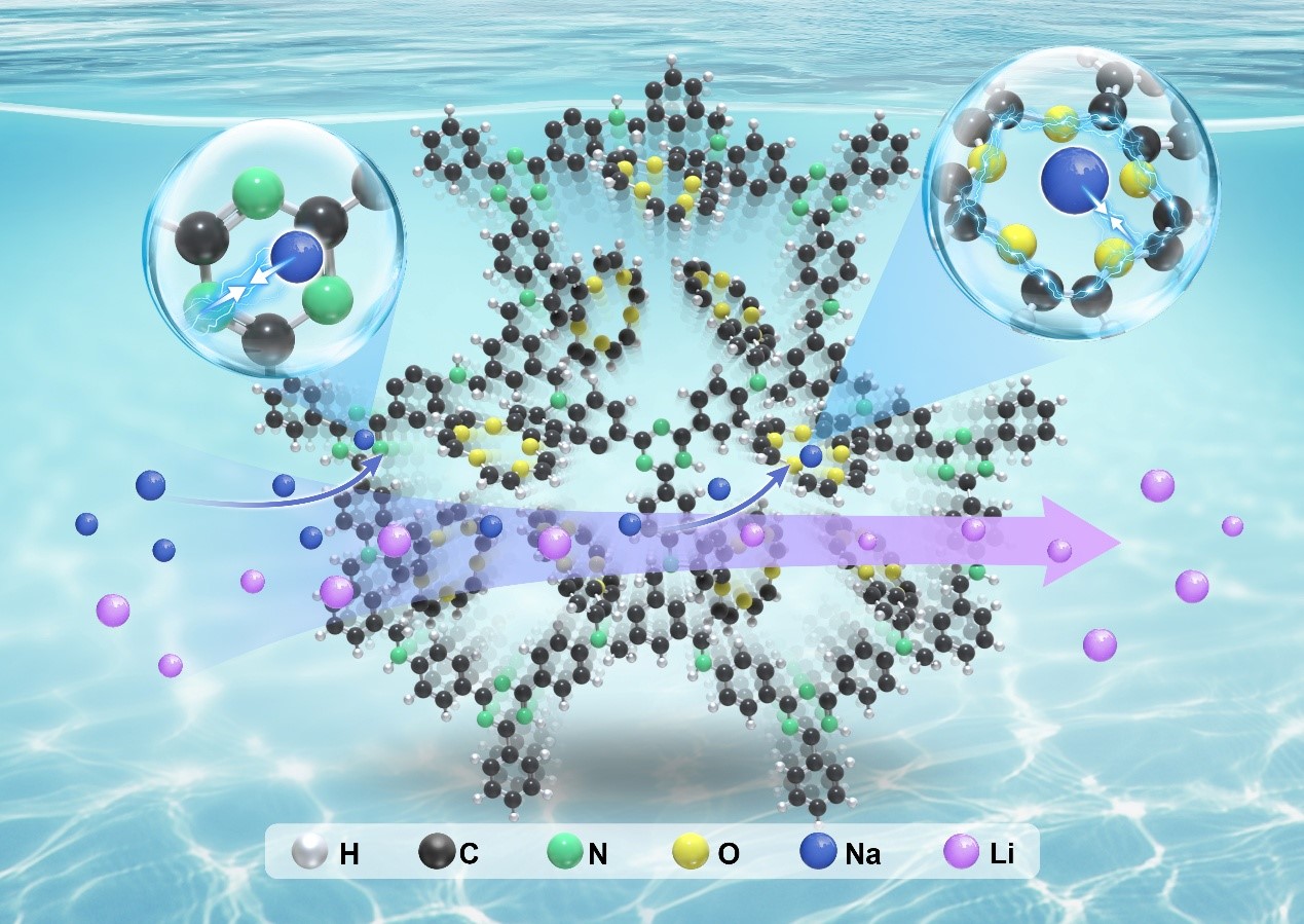 近日,青海鹽湖所膜分離提鋰技術(shù)與應(yīng)用團(tuán)隊(duì)和電化學(xué)分離技術(shù)團(tuán)隊(duì)在Chemical Engineering Journal期刊上發(fā)表題為“Synergy of framework dynamics and crown ether chemistry in covalent organic frameworks for Na+ capture(共價(jià)有機(jī)框架中框架動(dòng)力學(xué)與冠醚化學(xué)的協(xié)同效應(yīng)助力鈉離子捕獲)”的研究進(jìn)展,青海鹽湖所博士生何小祥為論文第一作者,膜分離提鋰技術(shù)與應(yīng)用團(tuán)隊(duì)的朱朝梁副研究員、徐國旺博士和電化學(xué)分離技術(shù)團(tuán)隊(duì)的高丹丹研究員為共同通訊作者。在這項(xiàng)工作中,科研人員開發(fā)了一種新的柔性COFs的合成策略,在水溶液中通邊攪拌單體90分鐘內(nèi)合成了ISL-COF-1和ISL-COF-2,并通過后合成修飾柔性COFs制備了4-溴苯并-15-冠-5功能化的COFs(ISL-COF-1CE/2CE)。表征結(jié)果表明,修飾后的COFs在保持高結(jié)晶度的同時(shí),實(shí)現(xiàn)了15C5的有效固定。其中,ISL-COF-1CE展現(xiàn)出顯著的Na?吸附性能(63.7 mg/g),優(yōu)異的選擇性吸附(Na?:41.4 mg/g vs Li?:5.8 mg/g)和循環(huán)穩(wěn)定性(10次循環(huán)后效率>90%),證明了在Na?吸附方面的卓越性能。動(dòng)力學(xué)和熱力學(xué)分析表明,吸附過程符合偽二階模型和朗格繆爾等溫線,且為吸熱自發(fā)反應(yīng)。DFT計(jì)算揭示冠醚位點(diǎn)為主要結(jié)合位點(diǎn),其次為三嗪N,而C–NH基團(tuán)作用較弱。實(shí)驗(yàn)分析和理論計(jì)算表明,ISL-COF-1CE在Na?吸附方面的卓越性能源于冠醚配位、柔性框架、靜電相互作用與親水性增強(qiáng)的協(xié)同效應(yīng)。該研究不僅闡明了冠醚-COFs中主-客體的相互作用機(jī)制,還為開發(fā)高效離子分離吸附劑提供了新策略。