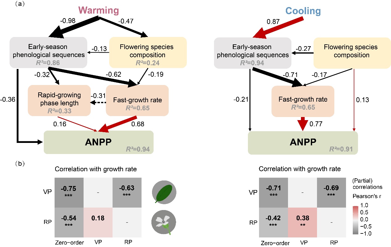 研究結(jié)果表明,在15年增溫處理下,ANPP顯著增加,而在降溫處理下降低。值得注意的是,增溫對ANPP的促進效應(yīng)隨時間推移逐漸增強,而降溫的抑制效應(yīng)則未表現(xiàn)出顯著的時間依賴性。重要的是,生長季早期物候影響了ANPP對增溫和降溫的響應(yīng)。關(guān)鍵發(fā)現(xiàn)在于,生長季早期的物候變化在調(diào)節(jié)ANPP對溫度變化的響應(yīng)中發(fā)揮重要作用。具體而言,增溫條件下ANPP的增加與植物返青期提前及生長速率加快密切相關(guān);而在降溫條件下,葉片與開花物候?qū)χ参锷L表現(xiàn)出解耦的級聯(lián)效應(yīng):返青期提前反而抑制了植物后續(xù)生長,而開花期推遲則部分抵消了前期的不利影響。