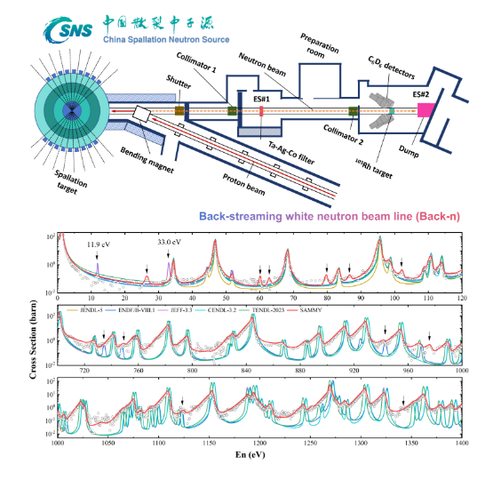 在中子俘獲反應(yīng)研究方面,研究團(tuán)隊(duì)基于中國散裂中子源反角白光中子束線(CSNS Back-n),利用高純度銠-103靶材開展了1eV-1MeV能區(qū)中子俘獲反應(yīng)截面的直接測量。實(shí)驗(yàn)結(jié)果表明,國際主要評價數(shù)據(jù)庫ENDF/B-VIII.1,JEFF-3.3和JENDL-5中11.9 eV和33.0 eV處標(biāo)注的共振能級并不存在。分析認(rèn)為,上述數(shù)據(jù)庫中的共振峰可能源于早期實(shí)驗(yàn)樣品中鉑族元素鈀(108Pd)與鉑(195Pt)雜質(zhì)的貢獻(xiàn)。此外,基于CSNS Back-n束流的高注量率和優(yōu)異的飛行時間分辨能力,本次實(shí)驗(yàn)首次發(fā)現(xiàn)了銠-103的8個新共振峰,并利用R-矩陣程序SAMMY提取了相應(yīng)的共振參數(shù)。