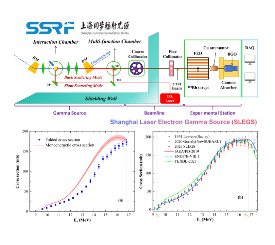 圖2 :SSRF SLEGS線站光核反應(yīng)實(shí)驗(yàn)布局、103Rh(γ,n)反應(yīng)實(shí)驗(yàn)截面值與評價庫的比較