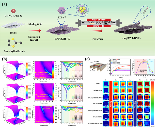 圖1.(a) Co@CNT/BNF復合材料制備示意圖;(b) 吸波性能和(c) 導熱性能。