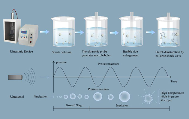 超聲波輔助淀粉改性是一種新興的綠色物理方法,它利用空化效應和機械剪切作用破壞淀粉的結(jié)晶區(qū)域,改變顆粒形態(tài),增加比表面積,從而有效提升淀粉的溶解性、親水性和功能特性。相比傳統(tǒng)的化學和酶法改性方式,超聲波改性避免了化學試劑的使用及生物催化劑的殘留,更安全且環(huán)保。?