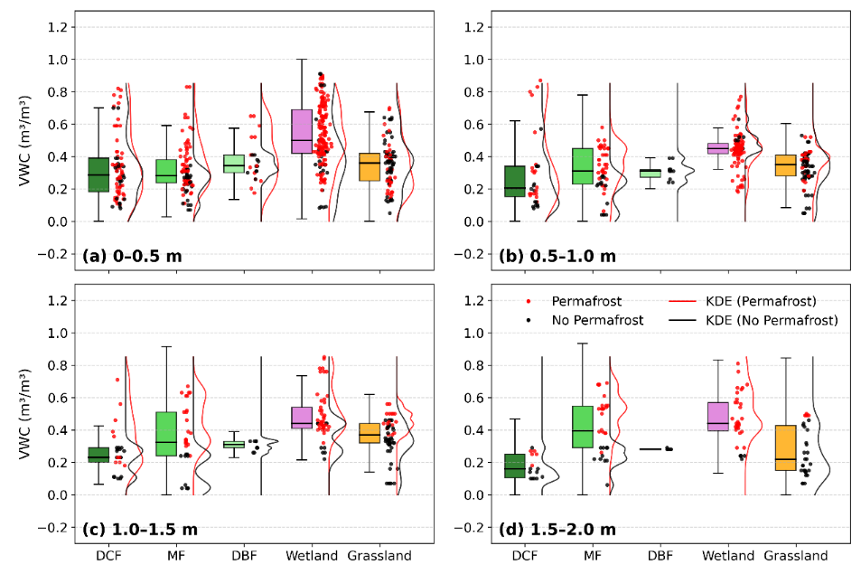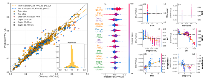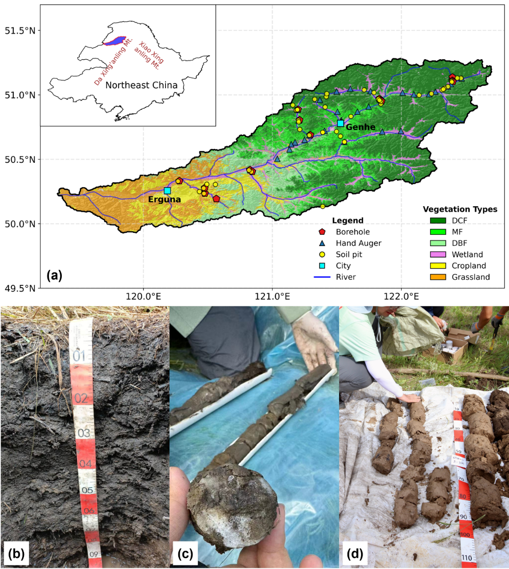 研究團(tuán)隊(duì)在根河流域布設(shè)75個(gè)淺層土壤剖面和15個(gè)深達(dá)20米的鉆孔,獲取了覆蓋森林、草地、濕地等不同下墊面的土壤含水量觀測數(shù)據(jù)。并結(jié)合可解釋機(jī)器學(xué)習(xí)與結(jié)構(gòu)方程模型,系統(tǒng)揭示了邊緣多年凍土區(qū)土壤水分的“垂向分層”特征及其控制機(jī)制。