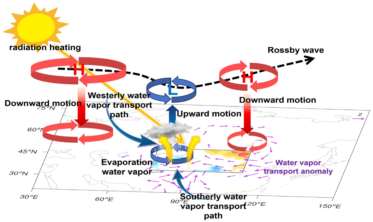 研究進(jìn)一步揭示,大尺度氣候背景場(chǎng)變化為局地水循環(huán)增強(qiáng)提供了有利條件。當(dāng)前處于正相位的北大西洋多年代際振蕩(AMO),通過激發(fā)跨歐亞大陸的羅斯貝波列,增強(qiáng)西北地區(qū)上空水汽輻合、抑制水汽向東輸出,為降水增加創(chuàng)造了關(guān)鍵動(dòng)力條件。