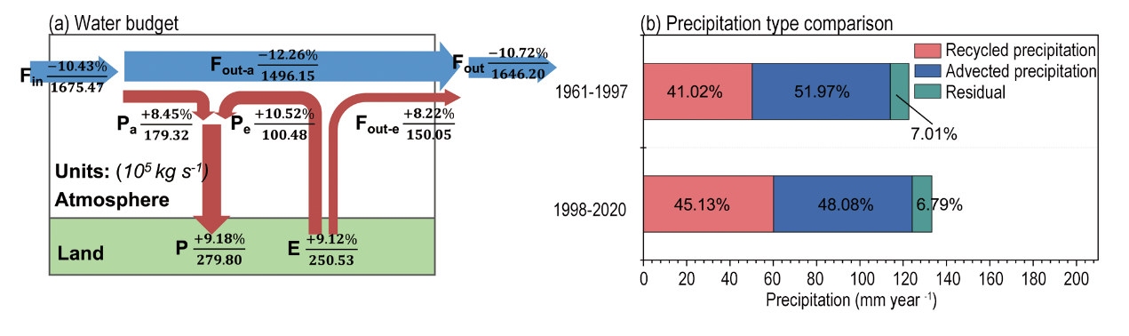 (a)西北干旱區(qū)水分收支圖(圖中數(shù)據(jù)分母為1998–2020年夏季各變量的多年平均值,單位為10? kg/s;分子表示1998–2020年平均值相較于1961–1997年平均值的增加量。其中,F(xiàn)in為水汽流入量,F(xiàn)out為水汽流出量,F(xiàn)out-a和Fout-e分別表示由水平水汽輸送與局地蒸散發(fā)產(chǎn)生的流出水汽;Pa為外部平流水汽形成的降水,Pe為再循環(huán)降水,P為總降水;E為蒸散發(fā));(b)西北干旱區(qū)夏季不同降水類型對(duì)比(1961–1997年與1998–2020年平均值;上行:1961–1997年,下行:1998–2020年;紅色:再循環(huán)降水,藍(lán)色:外循環(huán)降水,綠色:殘余項(xiàng);數(shù)值表示各類型水汽占同期總降水的百分比)。
