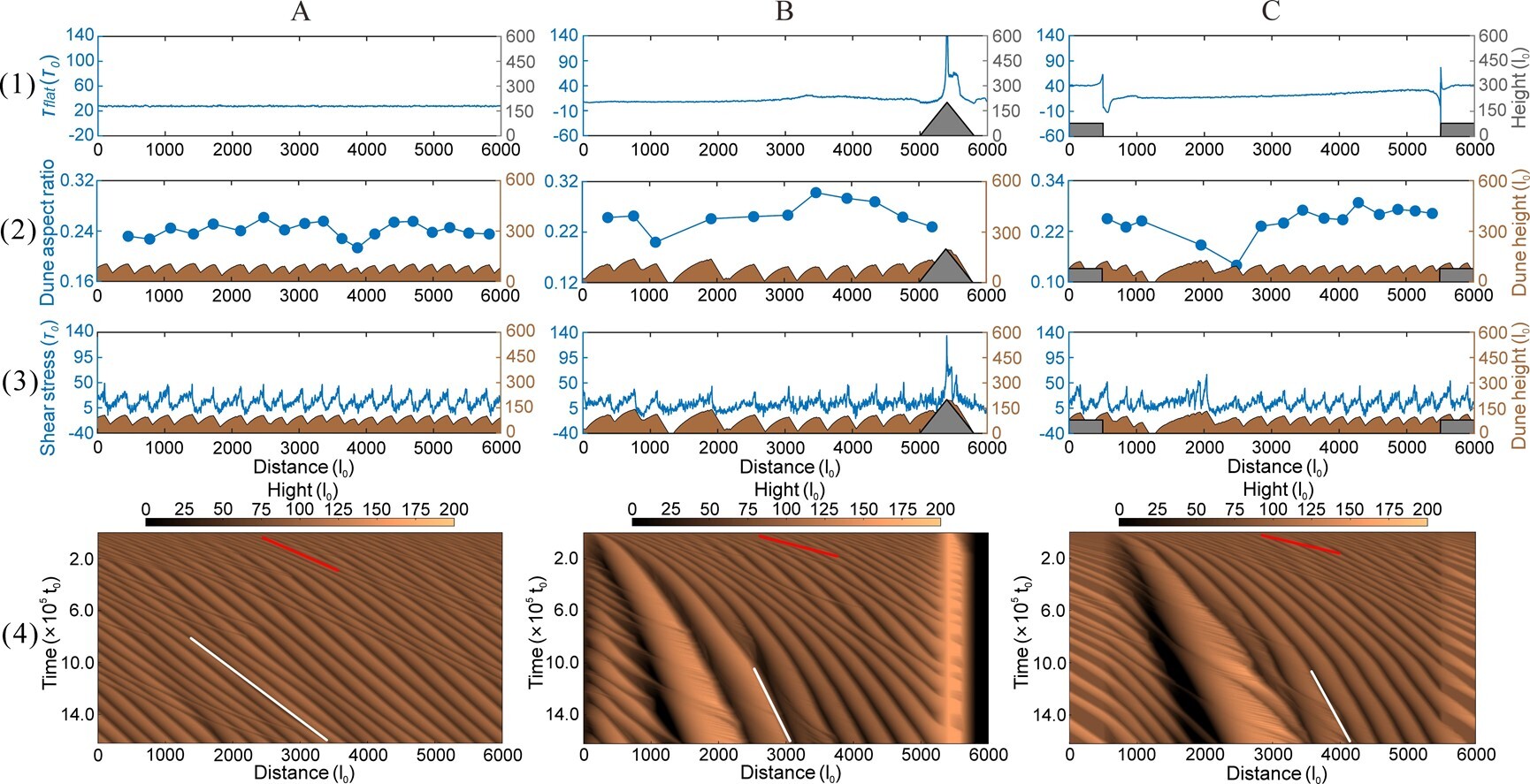 數(shù)值模擬結(jié)果揭示了沙山發(fā)育的核心機(jī)制:平坦地形下沙物質(zhì)均勻分配,抑制高大沙山發(fā)育;山體、盆地等正負(fù)地形引發(fā)剪切應(yīng)力突變,增強(qiáng)沙通量匯聚與沙丘碰撞融合,加速沙丘“粗化”長(zhǎng)高。地形通過(guò)持續(xù)塑造風(fēng)場(chǎng)與沙源空間異質(zhì)性,成為高大沙山形成的關(guān)鍵動(dòng)力。