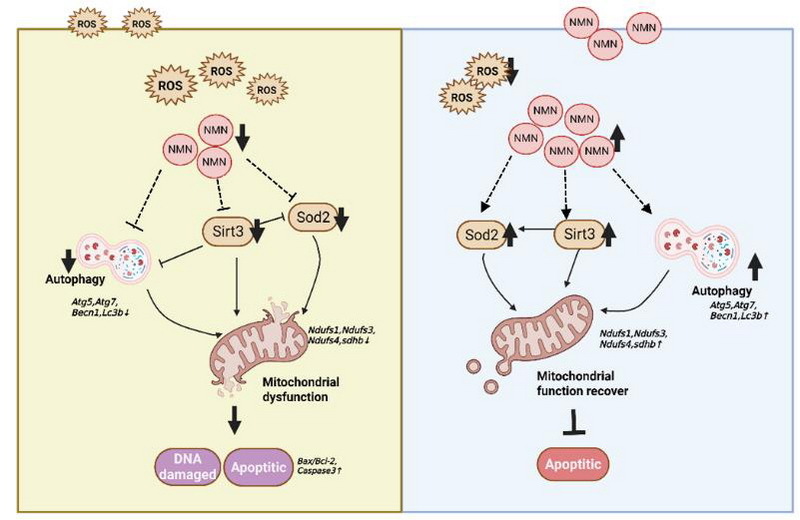 文章模式圖:胚胎期低氧通過 Sirt3/sod2 通路導致卵母細胞氧化應激損傷,而煙酰胺單核苷酸添加可以部分恢復卵母細胞及卵巢功能