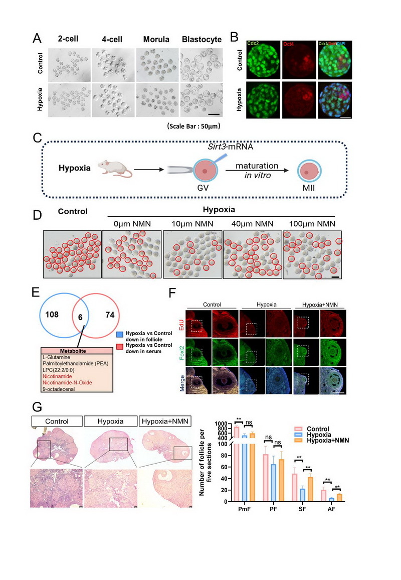 文章代表圖:(A)對照組與低氧組 2-細胞、4 -細胞、桑椹胚及囊胚期小鼠胚胎代表圖片(標尺:50 μm)。(B)對照組與低氧組囊胚中滋養(yǎng)層細胞標記物 Cdx2(綠色)、內(nèi)細胞團標記物 Oct4(紅色)及核標記 DAPI(藍色)的免疫熒光共定位結(jié)果。(3)Sirt3 mRNA顯微注射低氧GV 期卵母細胞,進行Sirt3過表達實驗。 (D) 對照組及低氧組卵母細胞在不同濃度 NMN 體外處理后的成熟情況對比(紅色圈標記成熟卵母細胞,標尺:50 μm)。(E)低氧組與對照組卵泡液及血清中差異代謝物的交集分析,下方列出 6 個核心重疊差異代謝物。(F)對照組、低氧組及低氧 + NMN 組卵巢組織中增殖標記物 EdU(紅色)、顆粒細胞分化標記物 Foxl2(綠色)及 Merge 圖的免疫熒光結(jié)果(白色虛線框為局部放大區(qū)域,標尺:200 μm)。(G) 卵巢組織形態(tài)學分析與卵泡計數(shù):對照組、低氧組及低氧 + NMN 組卵巢組織 H&E 染色結(jié)果(左圖,標尺為400 μm);各組原始卵泡(PmF)、初級卵泡(PF)、次級卵泡(SF)及有腔卵泡(AF)在 5 張連續(xù)切片中的數(shù)量統(tǒng)計(右圖)。