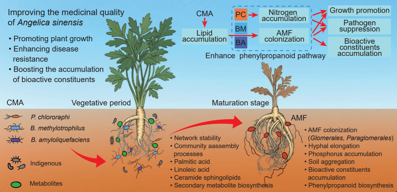 相關(guān)研究成果分別以 An attapulgite–Bacillus amyloliquefaciens biocontrol agent increases growth and medicinal metabolite content in Angelica sinensis by modulating hormonal and phenylpropanoid pathways和Functionally complementary bacterial inoculant coordinates arbuscular mycorrhizal fungi to improve Angelica sinensis root yield and quality為題,發(fā)表在期刊 BMC Plant Biology和iMetaOmics上。西北研究院博士畢業(yè)生劉洋和助理研究員張宗瑜分別為兩篇論文第一作者,王若愚研究員為通訊作者。研究得到中國科學(xué)院國際合作局全球共性挑戰(zhàn)專項、甘肅省科技重大專項、甘肅省國際科技合作基地及甘肅省自然科學(xué)基金的資助。