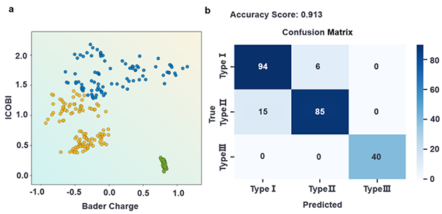 團(tuán)隊(duì)進(jìn)一步引入機(jī)器學(xué)習(xí)分類方法,以ICOBI(晶體軌道鍵指數(shù))和Bader電荷轉(zhuǎn)移量為特征,訓(xùn)練支持向量分類器。五折交叉驗(yàn)證表明分類器達(dá)到較高準(zhǔn)確率,在不依賴電負(fù)性概念的前提下,從電子結(jié)構(gòu)層面揭示了共價(jià)鍵合與離子鍵合特性之間的區(qū)別是不同吸附物應(yīng)變響應(yīng)差異的物理本質(zhì)。