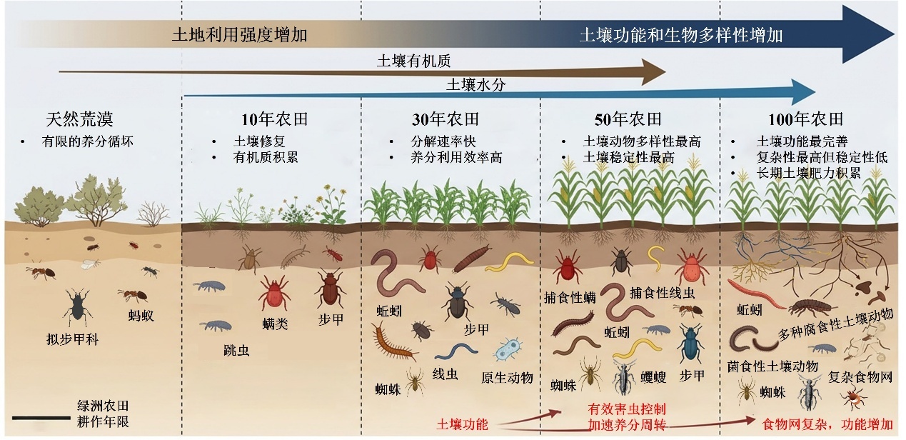 研究發(fā)現(xiàn),與荒漠相比,干旱區(qū)灌溉農(nóng)田的土壤動物多樣性大幅提升,土壤動物功能也會隨著年限的增加而增多,但長期耕作及撂荒均會對土壤動物多樣性及其功能產(chǎn)生負(fù)面影響,進(jìn)而影響土壤健康與穩(wěn)定。