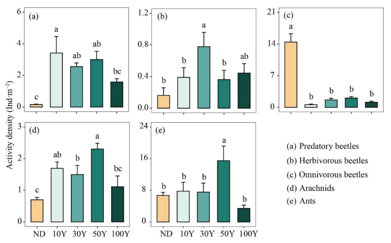 天然荒漠、10年、30年、50年和100年農(nóng)田捕食性甲蟲、植食性甲蟲、雜食性甲蟲、蛛形綱和螞蟻的活動密度