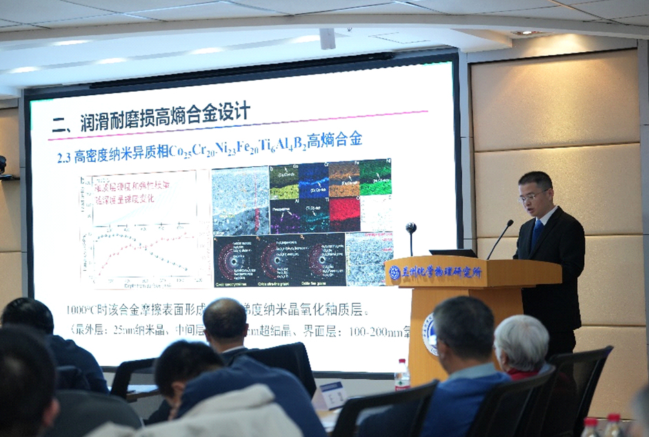 蘭州化物所所長、潤滑材料重點實驗室主任周峰研究員作了2024年度實驗室工作報告。詳細介紹了2024年實驗室重組和黨建創(chuàng)新文化建設(shè)情況,匯報了實驗室在科研成果、平臺建設(shè)、人才引進與培養(yǎng)、產(chǎn)業(yè)化等方面取得的成績和存在的問題與思考,提出了2025年工作重點及目標。隨后,程軍研究員和張耀明研究員分別作了題為“潤滑耐磨損高熵合金的設(shè)計研究”和“形狀記憶聚合物創(chuàng)制及其智能響應應用”的學術(shù)報告。