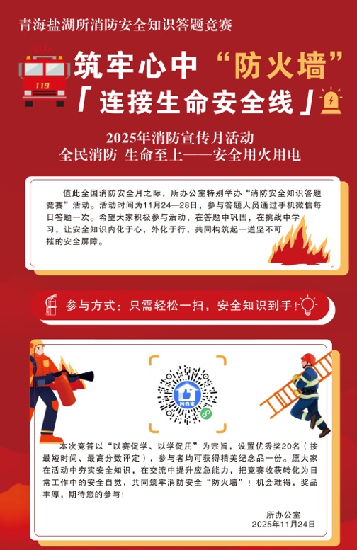 為切實(shí)筑牢消防安全防線,提升全員消防安全意識(shí)和應(yīng)急處置能力,在全國消防月期間,中國科學(xué)院青海鹽湖研究所創(chuàng)新消防安全教育形式,于11月24日至28日組織開展了線上消防安全知識(shí)競答活動(dòng),全所100余名職工及學(xué)生通過掃描二維碼參與活動(dòng),以賽促學(xué)、以學(xué)促用,營造了濃厚的消防安全學(xué)習(xí)氛圍。
