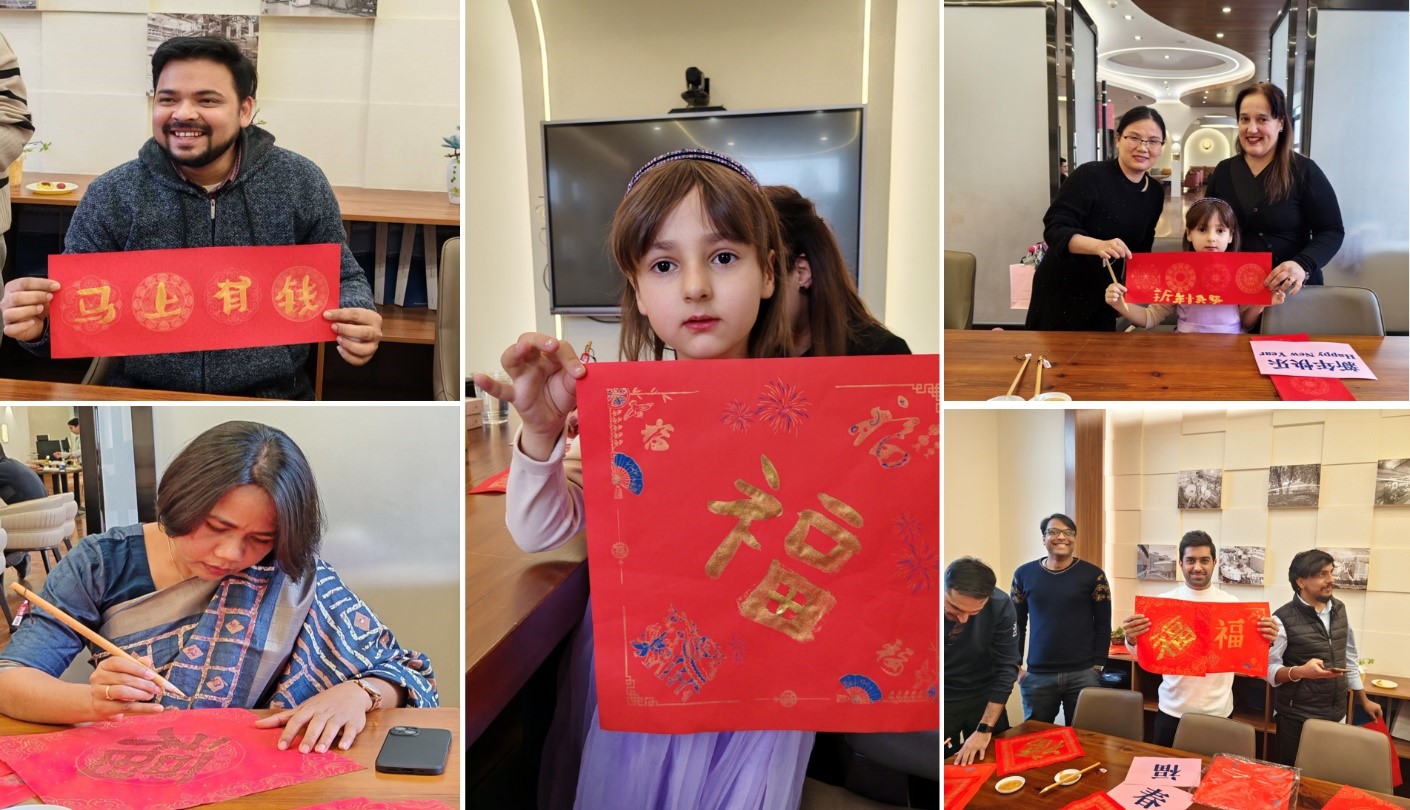 活動(dòng)精彩紛呈,在充滿墨香的中國傳統(tǒng)書法體驗(yàn)區(qū),外籍人員及家屬饒有興致地駐足打卡 “福字”、“對聯(lián)”書寫活動(dòng),一對對春聯(lián)、一個(gè)個(gè)福字躍然紙上,互道新年的美好祝福,近距離體驗(yàn)中華傳統(tǒng)文化魅力。