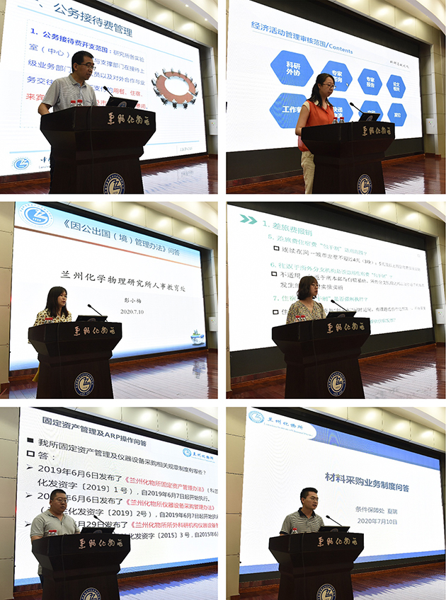 為繼續(xù)深化為科研人員減負,進一步解決科研經費“報銷繁”問題,使規(guī)章制度真正發(fā)揮促進科學、規(guī)范化管理的作用,7月10日上午,中國科學院蘭州化學物理研究所組織開展了經濟活動規(guī)章制度宣講培訓,各實驗室(中心)秘書、科研財務助理、管理部門相關人員約100人參加培訓會。青島中心、蘇州研究院通過視頻參會。