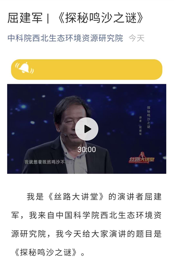 在西北研究院微信公眾號推送了屈建軍研究員主講的《探秘鳴沙之謎》科普報告,報告講述了其研究團(tuán)隊通過長年的科學(xué)研究,發(fā)現(xiàn)自然沙粒表面的多孔(坑)狀結(jié)構(gòu)所構(gòu)成的共鳴腔,是鳴沙發(fā)聲的關(guān)鍵所在。就像掏耳朵一樣,把堵在孔洞里的臟東西洗干凈,鳴沙就“復(fù)聲”了,實現(xiàn)了鳴沙的修復(fù),成功復(fù)活了鳴沙自然現(xiàn)象,讓失聲的沙子再“唱歌”。