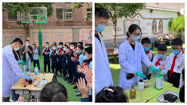 來自羰基合成與選擇氧化國家重點實驗室、固體潤滑國家重點實驗室、中科院西北特色植物資源化學重點實驗室和環(huán)境材料與生態(tài)化學研究發(fā)展中心的8名職工和研究生,開展了“CO2‘看得見’”系列互動實驗、“靜電‘吸引’‘懸浮’及釋放”實驗、“美麗的彩虹”系列實驗、“大象牙膏”實驗等4組實驗。他們用通俗易懂的語言介紹實驗用品和注意事項,結(jié)合生活中的現(xiàn)象講解實驗原理,認真仔細展示實驗步驟,現(xiàn)場答疑解惑,引導學生們自己動手去感受科學實驗的樂趣。