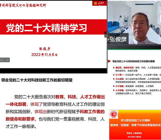 黨委委員、副所長張俊彥作了題為“黨的二十大精神學(xué)習”的專題報告。報告?zhèn)鬟_了習近平總書記在中國共產(chǎn)黨第二十次全國代表大會上的報告,重點解讀了報告對科技創(chuàng)新、人才工作的新要求新部署。他強調(diào),全體人員要充分認識學(xué)習宣傳貫徹黨的二十大精神的重大意義,全面準確學(xué)習領(lǐng)會黨的二十大精神,尤其要全面準確把握黨的二十大對科技創(chuàng)新工作的新要求新部署,切實增強國家戰(zhàn)略科技力量的責任感使命感,將學(xué)習的成效轉(zhuǎn)化為推進工作、促進研究所發(fā)展的強大動力。