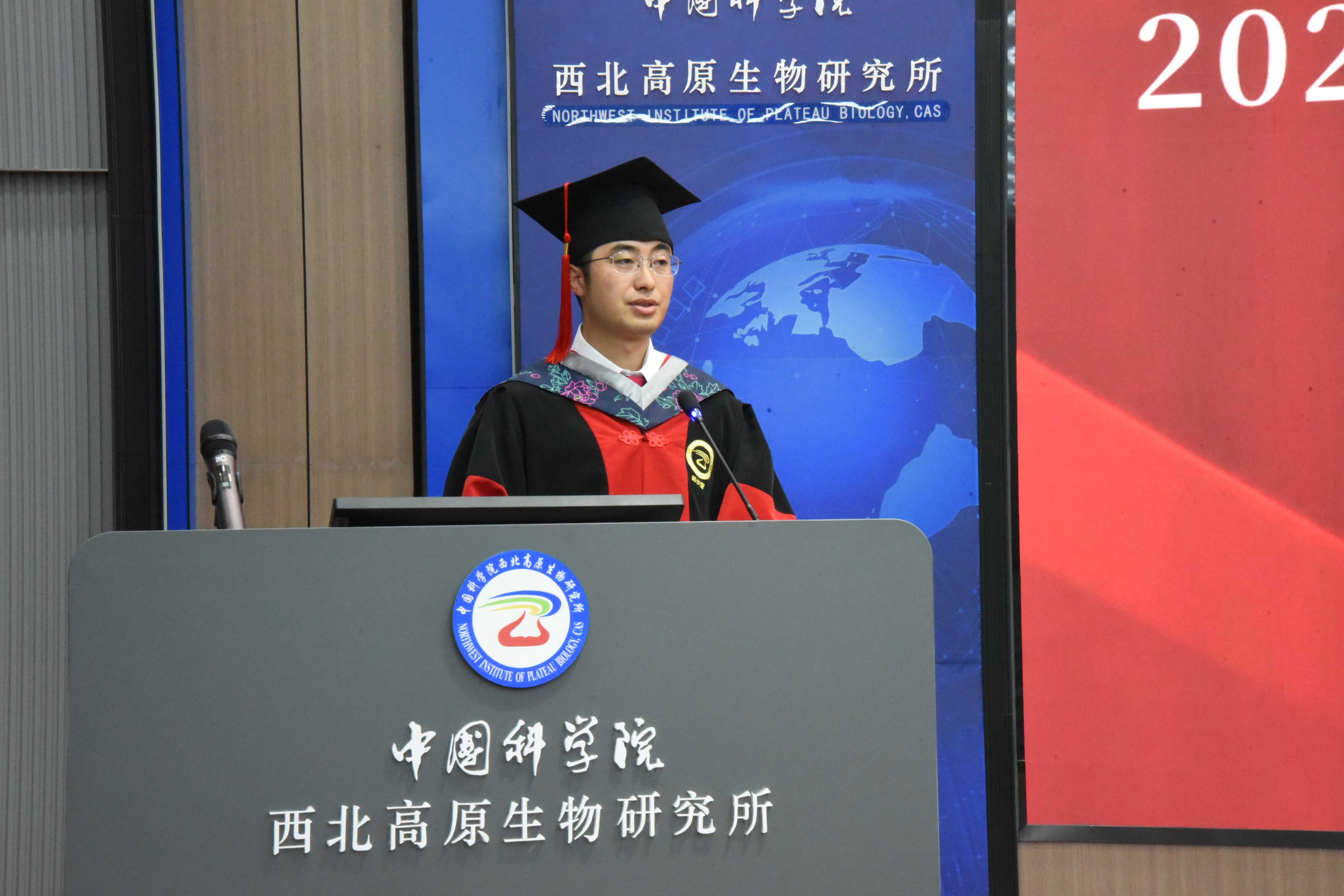 畢業(yè)典禮在莊嚴(yán)的國歌聲中拉開序幕。優(yōu)秀畢業(yè)生代表韓步鷹博士首先發(fā)言,他代表全體畢業(yè)生向培養(yǎng)他們的研究所和辛勤付出的導(dǎo)師們送上了最真摯的謝意和最美好的祝福。他說:“夏至是太陽北行的轉(zhuǎn)折點(diǎn),亦是畢業(yè)生們的轉(zhuǎn)折點(diǎn)。畢業(yè)不是終點(diǎn),而是新的起點(diǎn)。未來,同學(xué)們將肩負(fù)更大的責(zé)任和使命,繼續(xù)在各自的領(lǐng)域中發(fā)光發(fā)熱”,并莊嚴(yán)承諾,無論未來身處何地,全體畢業(yè)生都會銘記在西北高原所學(xué)到的知識和“牦牛精神”,不忘初心,砥礪前行。